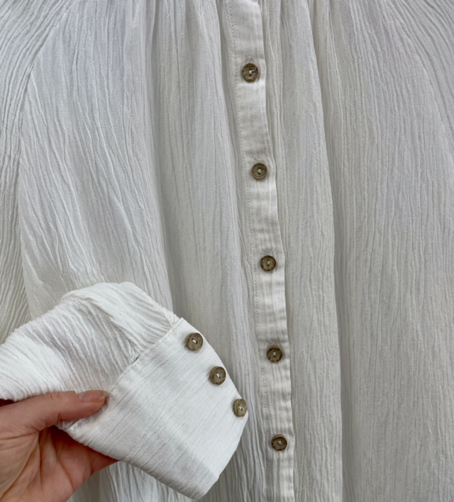 Chemise ample avec matière texturée légèrement transparente et petits boutons couleur bois.