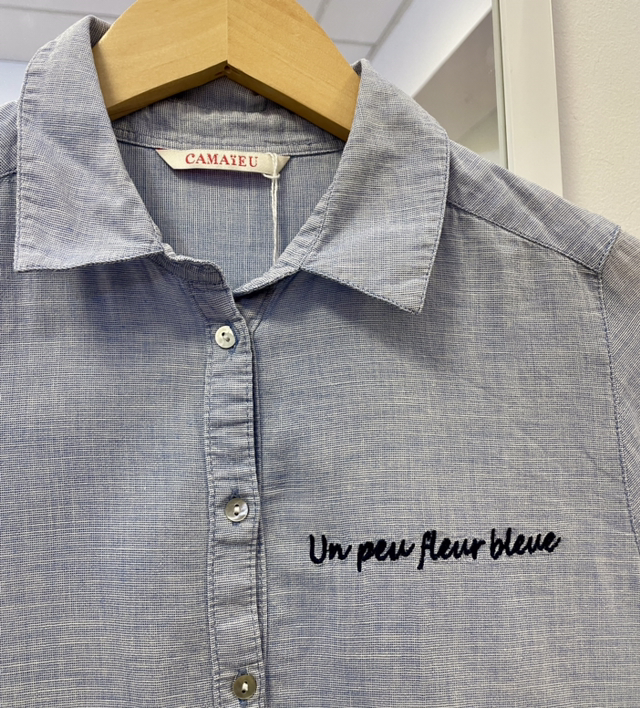 Coupe droite et Inscription « Un peu fleur bleue » brodée